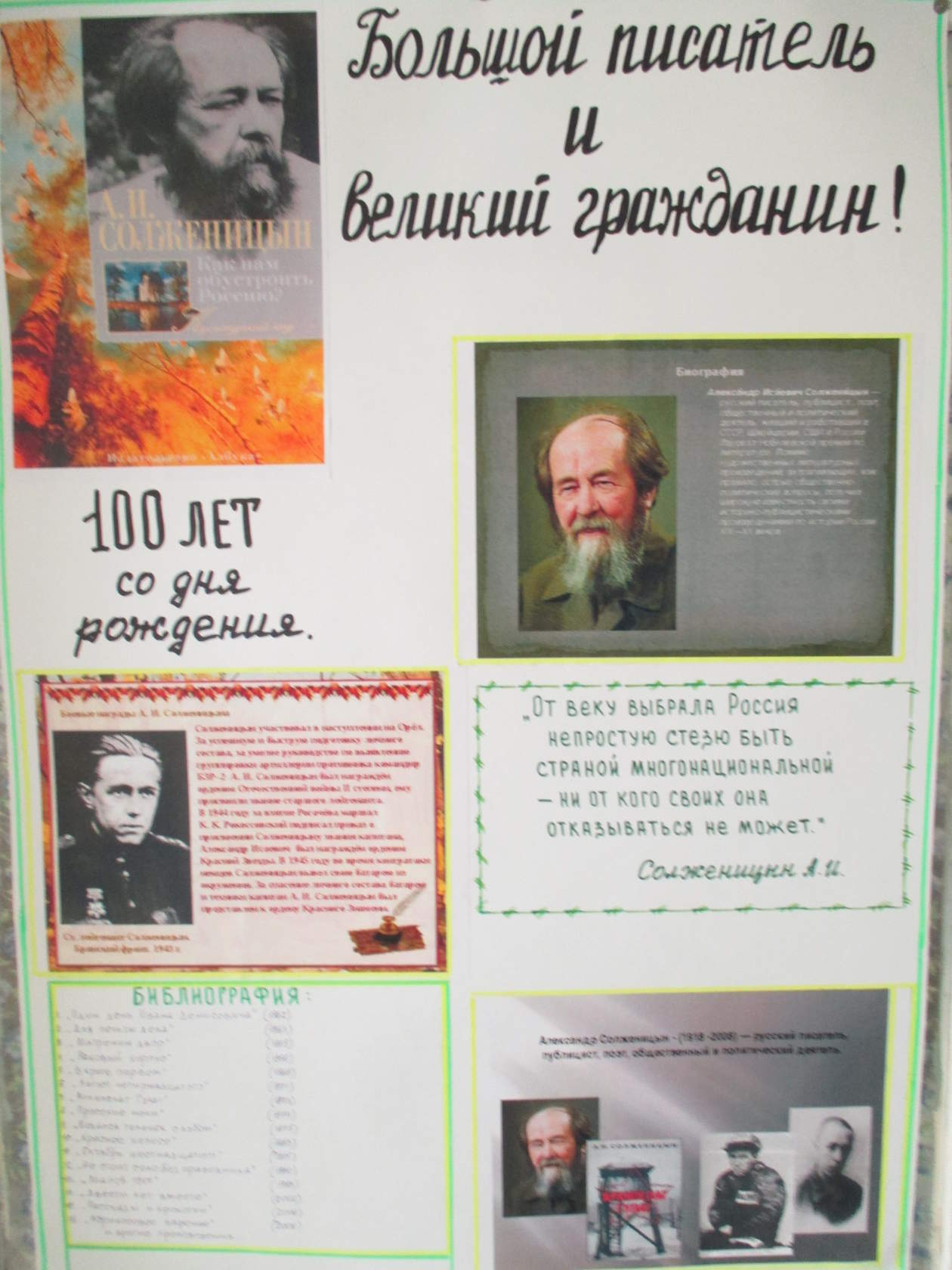 К 100-летию со дня рождения А. И. Солженицина, Ириновская библиотека-филиал оформила Книжную выставку "Жить надо по совести!" и Библиотечный плакат "Большой писатель и великий гражданин!"