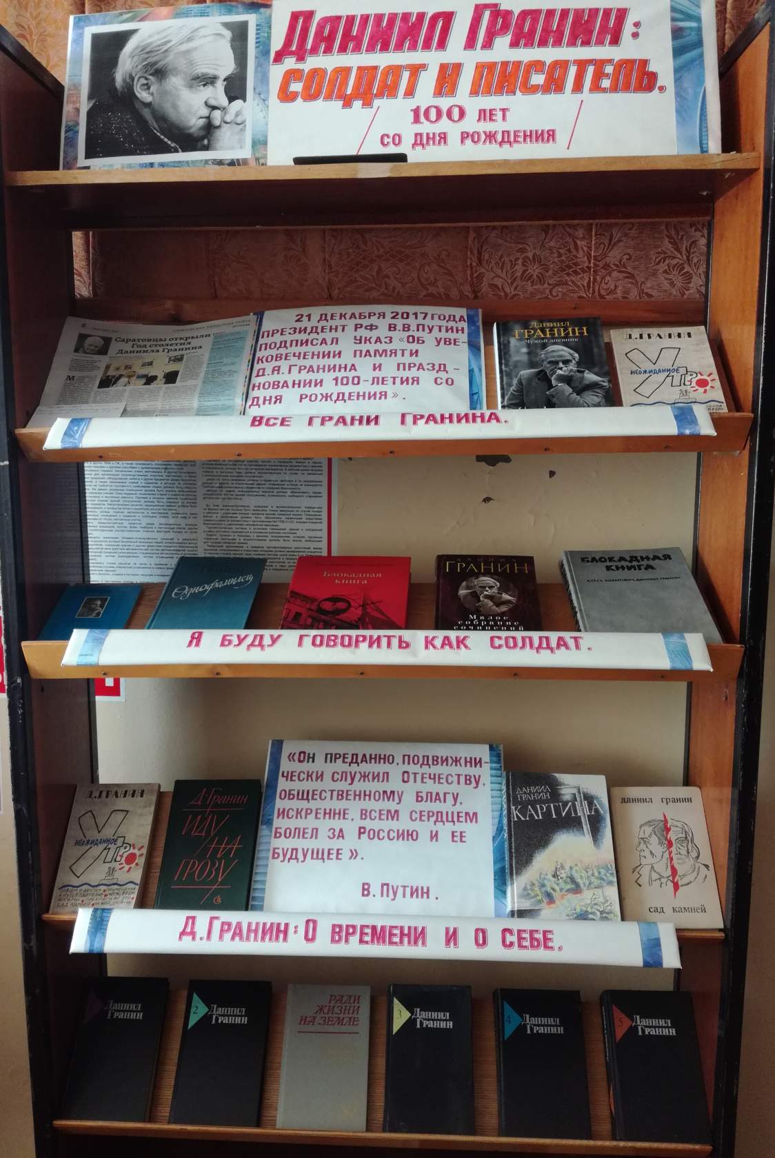 Уважаемые читатели! Указом Президента РФ объявлен Год столетия Даниила Гранина. К этому знаменательному событию в Центральной библиотеке подготовлена книжно-иллюстрированная выставка "Даниил Гранин:солдат и писатель" (100 лет со дня рождения). Это автор более 30 романов, документальных сочинений, лауреат российских и международных литературных премий и многих правительственных наград. На выставке представлены такие известные произведения Д.Гранина, как "Блокадная книга" (написана в соавторстве с А.Адамовичем), "Иду на грозу!", "Картина", "Зубр" и многие другие. Добро пожаловать в библиотеку!
