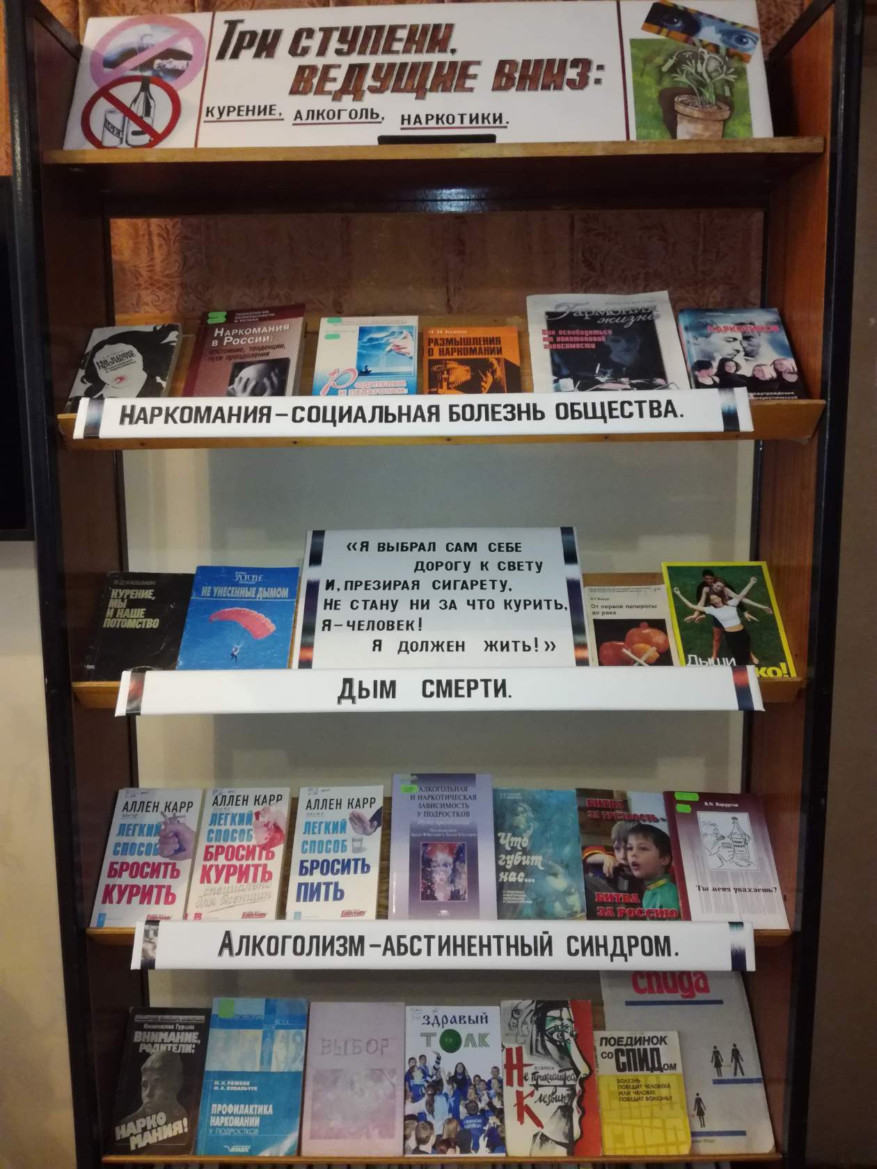 Уважаемые читатели ЦБ! В читальном зале ЦБ открылась новая книжная выставка «Три ступени, ведущие вниз: курение, алкоголь, наркотики». Это выставка-предупреждение для молодого поколения, насколько опасны эти вредные привычки. А кто уже стоит на краю пропасти, представленная на выставке литература поможет справиться с наркотической и алкогольной зависимостью, покажет пути преодоления табакокурения. Ждем Вас!